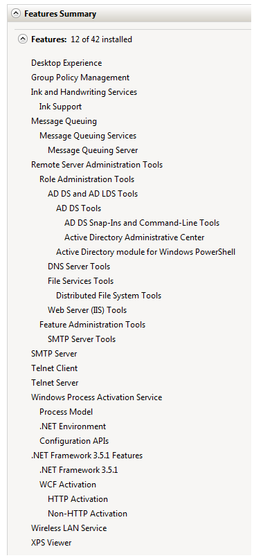 Most features get installed automatically as pre-requisites for the roles above or during installation of SharePoint 2010. This is a great thing about the new products – things don’t just fail because you forgot to activate a random feature: