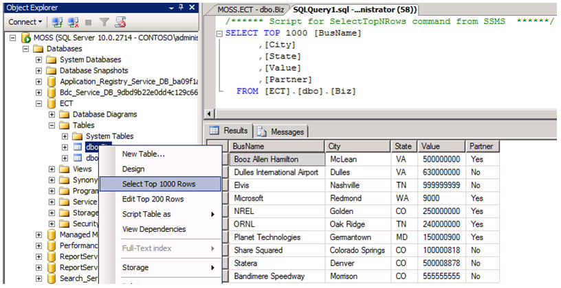 For this scenario, I built a very simple database with a single table containing 5 columns (Fig 1). Basically, I’ve created a Business Contacts DB for storing the business name, city, state, value, and partner status. After creating the DB, I added 9 rows from within the SQL Server Management Studio (SSMS) interface (Fig 2). For later use, remember that the DB Server is named “MOSS,” and the DB is named “ECT.”