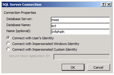 - Identity: I chose to connect with MY user identity – the user creating the ECT – but I of course have access to the SQL DB. If I didn’t, then I wouldn’t be able to make this. The 3rd option is the one that enables the Secure Store Application ID field at the bottom. This is the new Single Sign-On for those of you who used that in MOSS 2007.