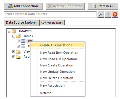This step is where the magic happens. After finding the table you want to use, right-click on it, and you will see some operations to choose (Fig 7). This part is beautiful, because it does it all for you without any code. In this case, I chose to Create All Operations. This options creates the well-known CRUD operations – Create, Read (Item), Update, and Delete – but it also creates an enumerate operation (Read List), so I like to call it CRUDE. 😛