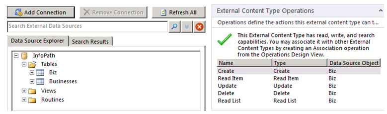 Fig 8 – A successfully created External Content Type with full CRUD operations