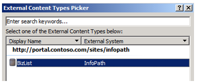 After clicking the External List button, you will be prompted to pick from a list of existing ECTs. In the previous blog, we created BizList, so that is what we will select (Fig 2).