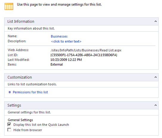 After SPD 2010 does its work, you will be taken to a new page that represents your External List (Fig 3). You can set the name, description, permissions, and general settings. Note the web address of the list, the list ID, and the fact that it is External. I will delve more into the permissions settings later when I get the chance.