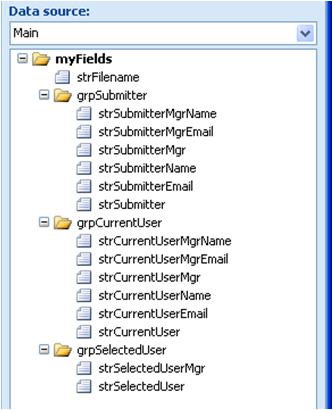 The reason why we’re using the a default value on strSubmitter and a rule for strCurrentUser is because using a default value makes the data populate once and stay the same during subsequent edits.  Since our current user may not be the same as the submitter, we must use a rule when the form opens to set strCurrentUser to the current user’s username while the strSubmitter field will always have the original submitter’s username.  All of the Submitter fields populated above will remain static, because there is always only one submitter.  The CurrentUser fields will always be dynamic depending on who opens the form.