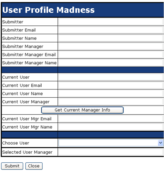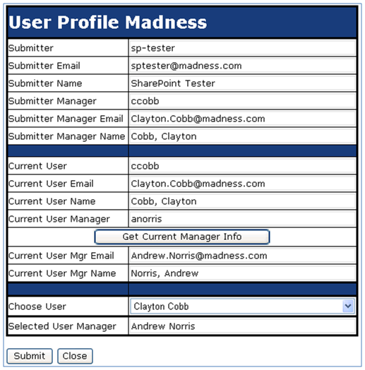 Submit your form, then re-open it with a different user account.  In my example, I started with a tester account and then logged in as myself to view the submitted form.  Notice that the Submitter information hasn’t changed, but the CurrentUser info now reflects the new user’s info, including that user’s manager’s username.  Click on the Get Current Manager Info button and watch the next two fields get populated with the Current User’s Manager’s information (Fig 17).