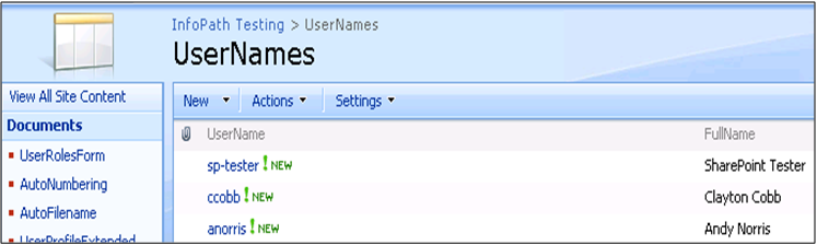 Create a Custom List on your SharePoint Site.  Change the Title column to UserName, and create another column named FullName.  Populate this list with 3 known users (Fig 3) and be sure to use their exact username (i.e. ccobb) and not the domain name (i.e. domain\ccobb).  For the Full Name, put whatever you prefer to use as a friendly name for that user.