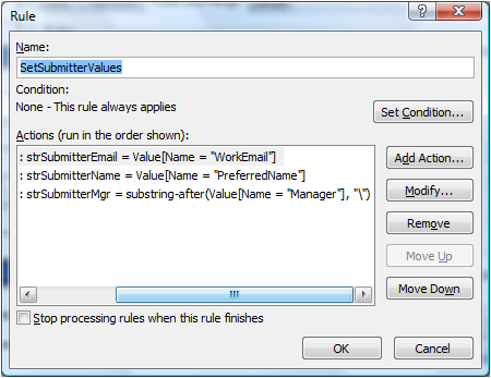 Create a rule with 3 actions that sets the values of the other 3 submitter fields (Fig 8).  Each action starts with “Set a field’s value,” but I have scrolled right to show the formulas.  Each formula is from the 2nd half of Itay’s blog entry.  I will show how to do the strSubmitterMgr rule as one example to follow for all three (Fig 9).  The actions HAVE to be in this order, or at least make sure that strSubmitterMgr is last in line.  Due to there being no conditions, this rule fires as soon as strSubmitter is populated by the userName() default value.