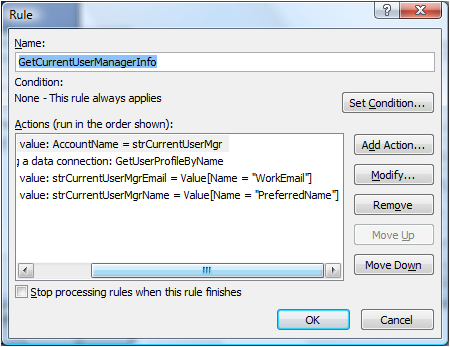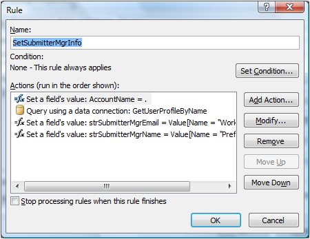The first rule requires some direct attention, because it is where the magic happens for this entire blog entry.  It looks simple and actually is simple, but it’s the part that people never think of or just don’t realize it can be done.  All we are doing is setting the AccountName field to the current field’s data.  Ok, so what is this AccountName field?  We never created such a thing!  Ah, well it’s the only node in the queryFields group of the GetUserProfileByName data connection.  We are taking the Manager’s username from strSubmitterMgr and sending it to this field just before querying that web service.  This sends the Manager’s username to the web service so that it will return the data set of profile information relevant to the Manager instead of the Submitter.  This is the key to getting information other than the current user’s!