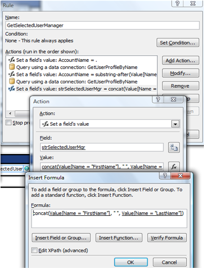For the 3rd action, remember to use this formula to get the Manager’s username: substring-after(Value[Name = “Manager”], “\”).  On the 5th step, use this new formula for concatenating the FirstName with the LastName (these are attributes from the web service): concat(Value[Name = “FirstName”], ” “, Value[Name = “LastName”]).