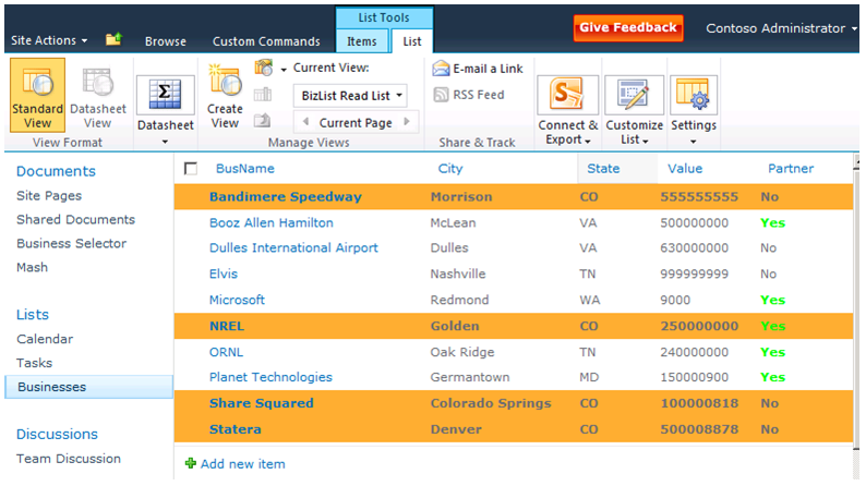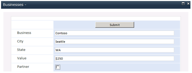 After submitting, the form returned me to the External List where I immediately could see the new business along with all of its associated data (Fig 5).