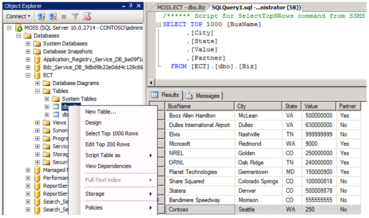 First off, we just take a quick jaunt over to SQL Server Management Studio (SSMS) to take a look at the Biz table in our ECT database, because that is the table feeding our External List. As you can see, it has 10 records (Fig 1).
